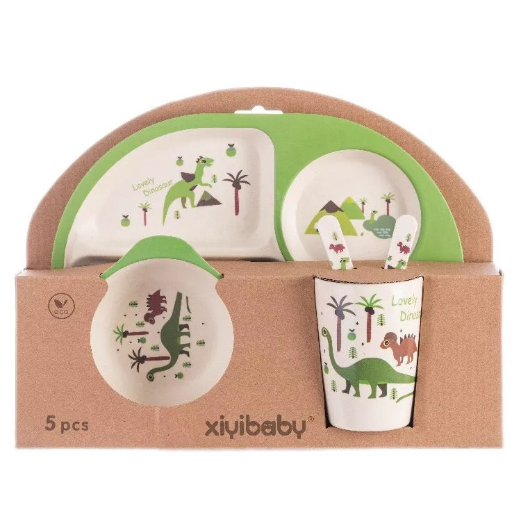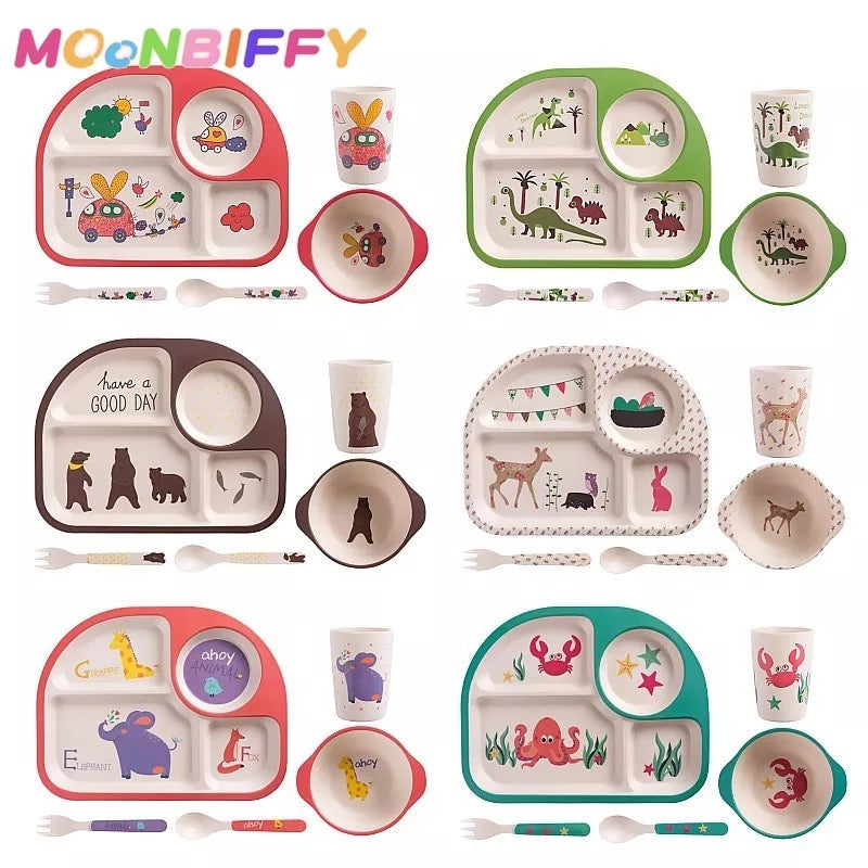 Juego de vajilla de fibra de bambú para niños y bebés, Set de 5 unids/set de animales de dibujos animados, plato, tazón, taza, tenedor, cuchara MOD HB-913