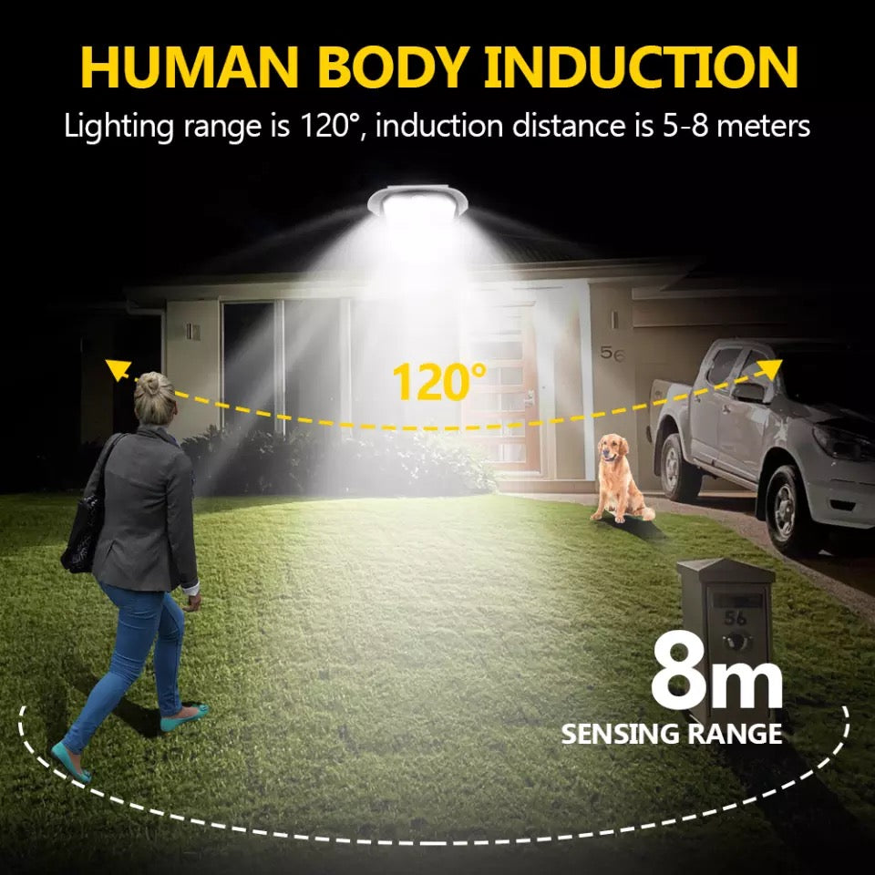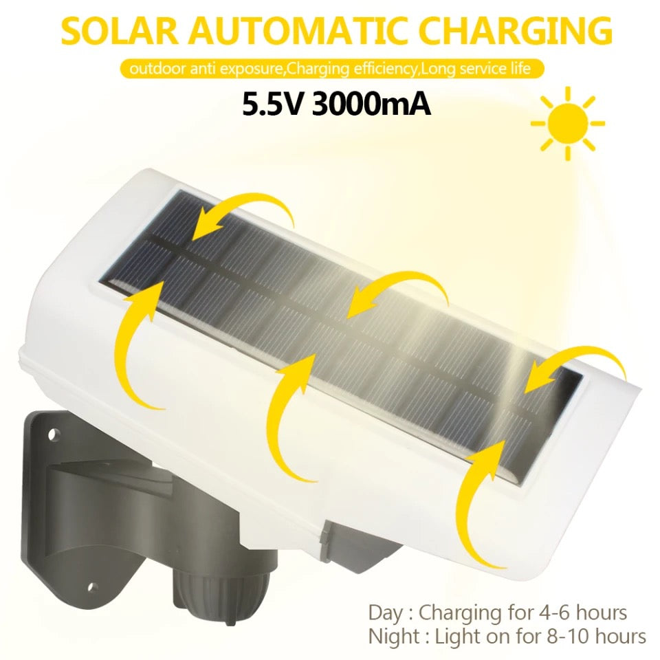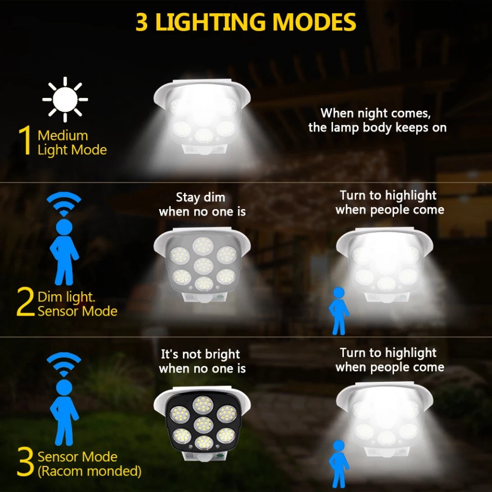 Lámpara Solar con detección de movimiento 77LED, iluminación de cámara simulada de seguridad de calle al aire libre con Control remoto IP65, foco de 3 modos para jardín. YH-2178T