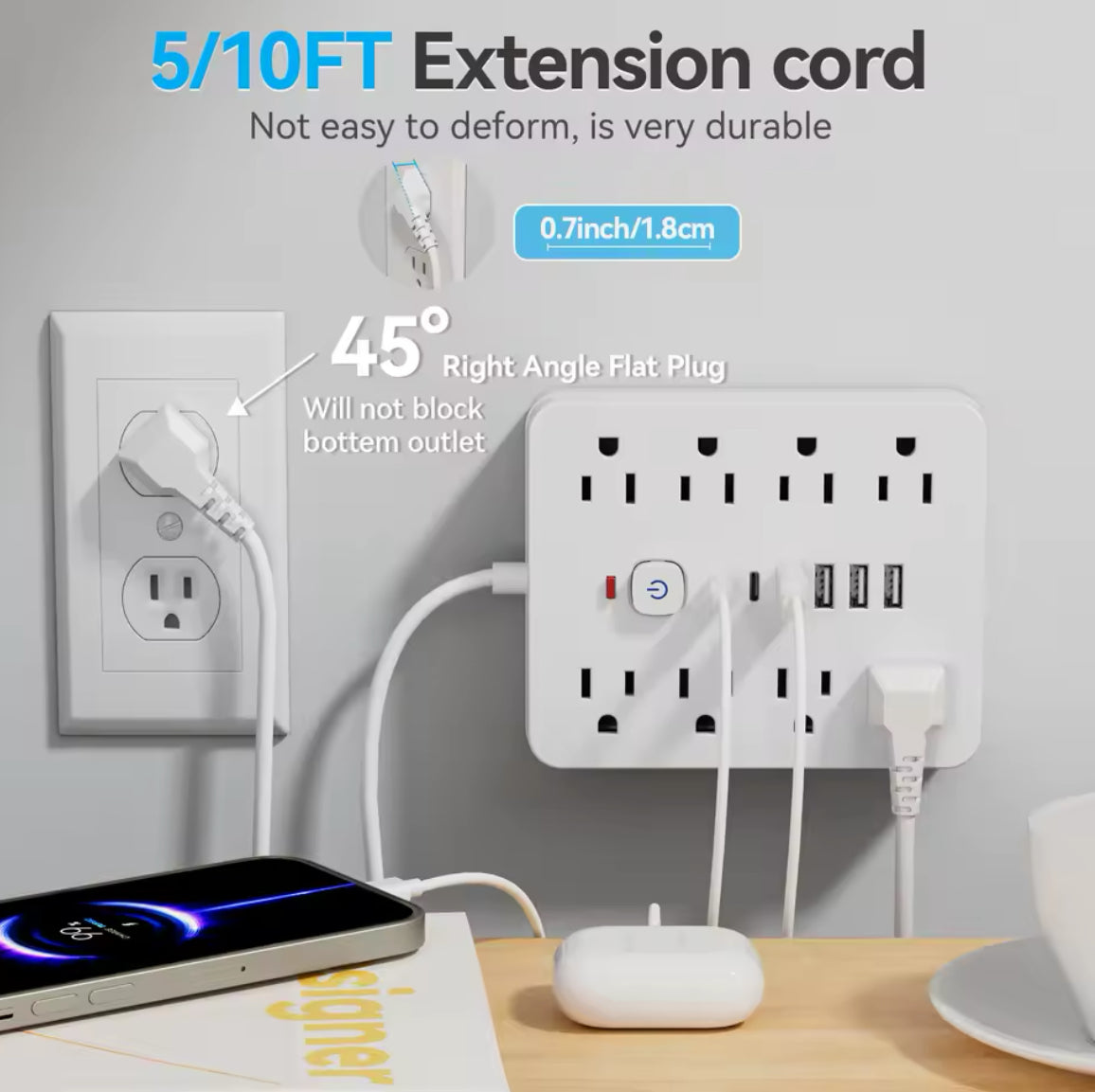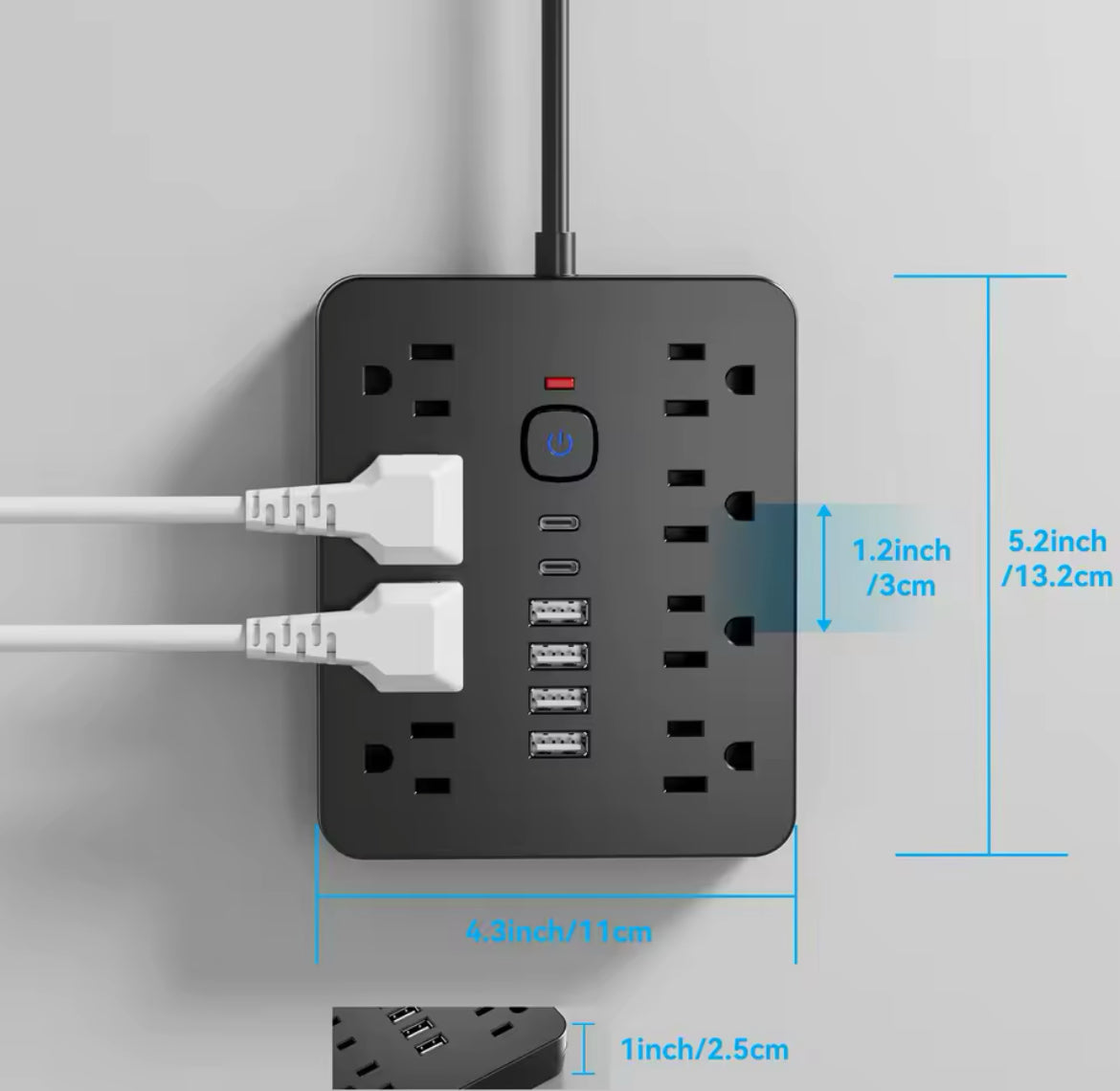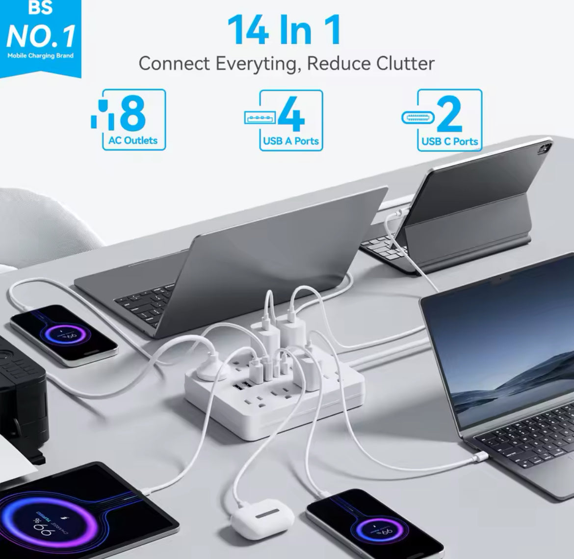 Protector contra sobretensiones de regleta de alimentación 14 en 1 con 8 salidas, 4 puertos USB y 2 puertos USB C, enchufe plano, soporte de pared, protección contra sobrecarga USB de escritorio MOD ZE-1153