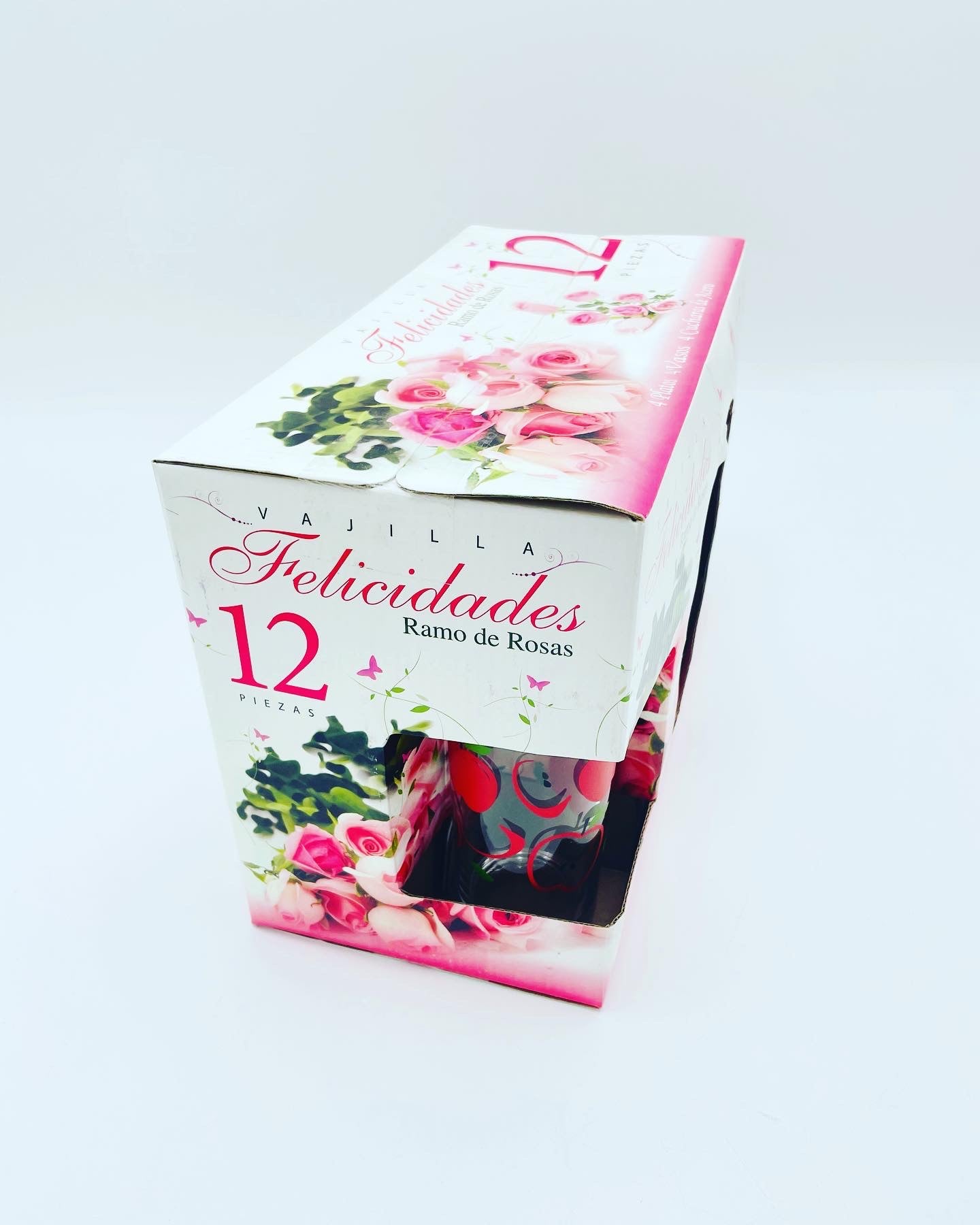 Set de vajilla de cristal 12 pz platos vasos cucharas MOD RAMO DE ROSAS